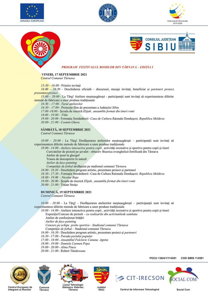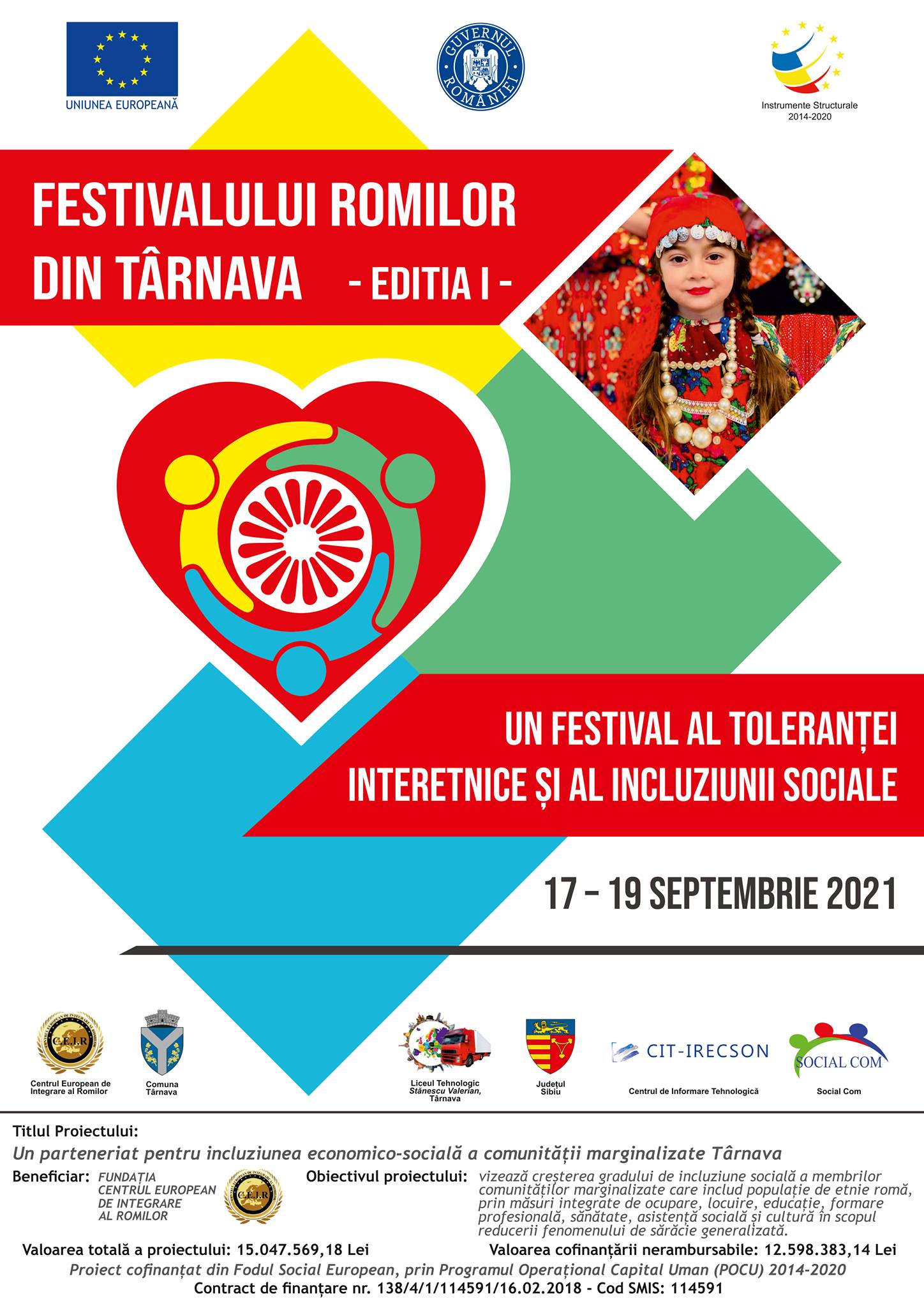 Romii au festivalul lor, weekendul acesta, în Târnava. Evenimentul, aflat la prima ediție, propune trei zile pline de activități, de la ateliere de meșteșugărit, activități pentru cei mici și bucate tradiționale, până la muzică și voie bună alături de ansambluri folclorice din județul Sibiu, din țară și chiar de peste granițe. Evenimentul poate fi numit și „Festivalul Toleranței Interetnice și al Incluziunii Sociale”, pentru că principalul obiectiv al proiectului este acela de a contribui la integrarea economică și socială a locuitorilor de etnie romă, respectiv a aproape 600 de persoane.