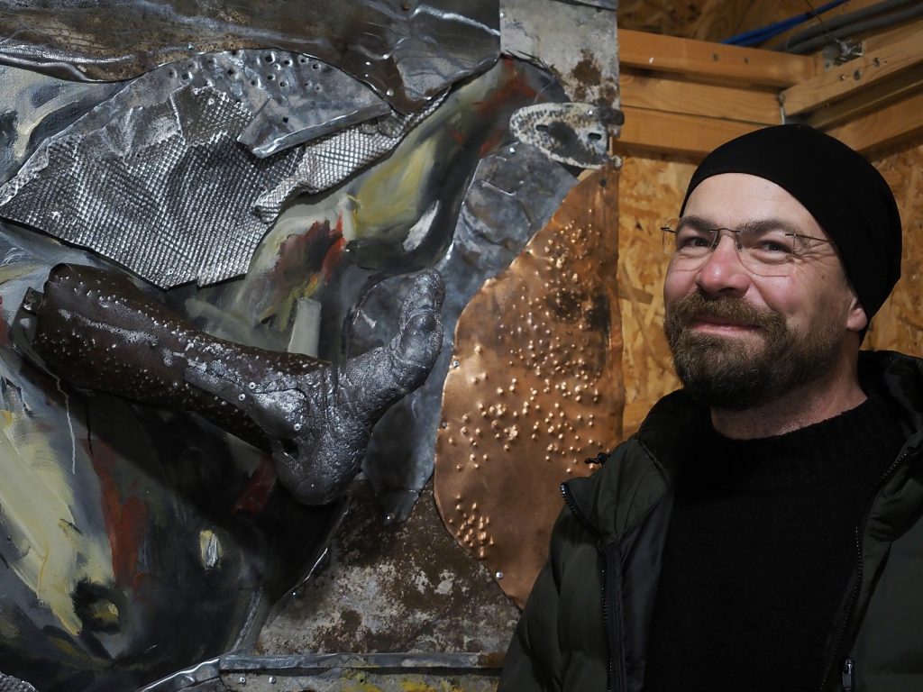 Florin Viorel, noul președinte al Uniunii Artiștilor Plastici, filiala Sibiu, a ales să vină în Orașul Artiștilor cu o lucrare de start a unei serii pe care a început-o în urmă cu trei ani, un ansamblaj de mari dimensiuni care combină o tehnică mixtă – pictură, metal, pânză și obiecte tridimensionale. „Este un mix între artă, regăsindu-se atât sculptura, cât și pictura, o tehnică de colaj dusă mai departe, în care se asamblează diverse materiale, un pas mai departe al colajului care presupune doar lipiri, suprafețe aproape plate, spre tridimensional”, explică artistul, care în prezent este doctorand și profesor la Liceul de Artă din Sibiu. Albaiulian la origini, a studiat pictura la Cluj-Napoca, iar după ce a făcut „o buclă” prin Transilvania, după cum spune, s-a stabilit la Sibiu, în urmă cu mulți ani. El a fost ales de curând președintele Uniunii Artiștilor Plastici, filiala Sibiu.