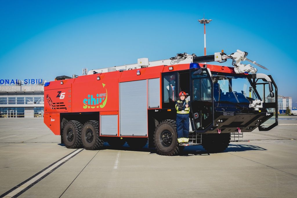 Aeroportul Internațional Sibiu înregistrează o premieră la nivel național. De curând, a intrat în posesia unei autospeciale inedite de stingere a incendiilor. Aceasta dispuune de un șasiu dedicat acestui tip de activitate de pe aeroporturi, fiind dotată și cu un tun cu braț extensibil ce poate ajunge până în interiorul aeronavei, în cazul în care se cere acest lucru.