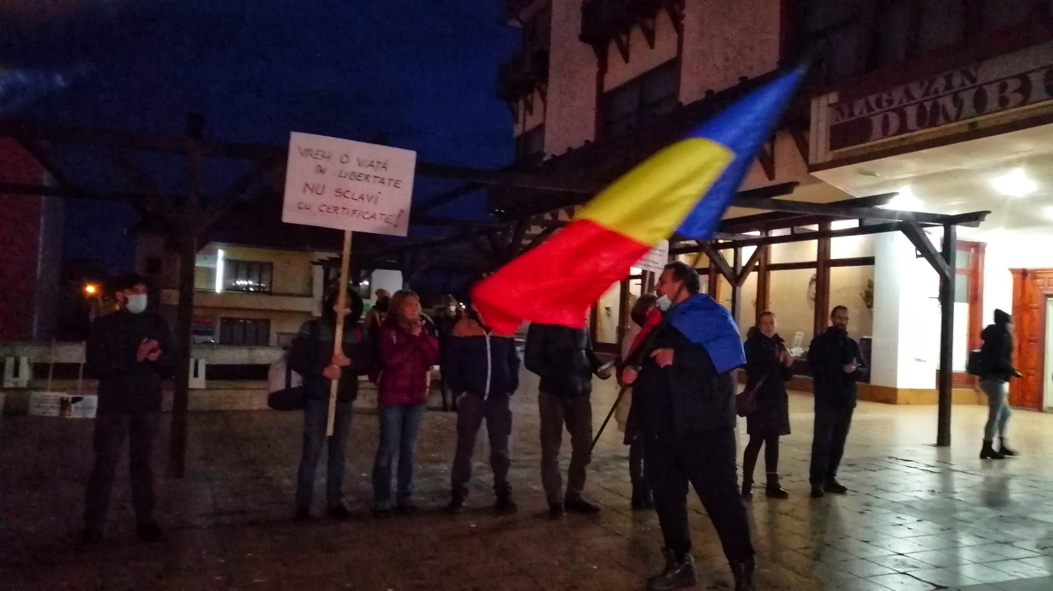 Aproximativ 100 de sibieni au ieșit, duminică, în stradă, pentru a protesta față de restricțiile în vigoare, în contextul pandemiei de coronavirus. Aceștia cer autorităților să elimine restricțiile de circulație, certificatul verde și obligativitatea purtării măștii de protecție. Sibienii antivacciniști se adunau, până astăzi, în fiecare duminică în Piața Mare, dar pentru că în centrul orașului are loc în această perioadă Târgul de Crăciun, astăzi și-au dat întâlnire în fața magazinului Dumbrava.
