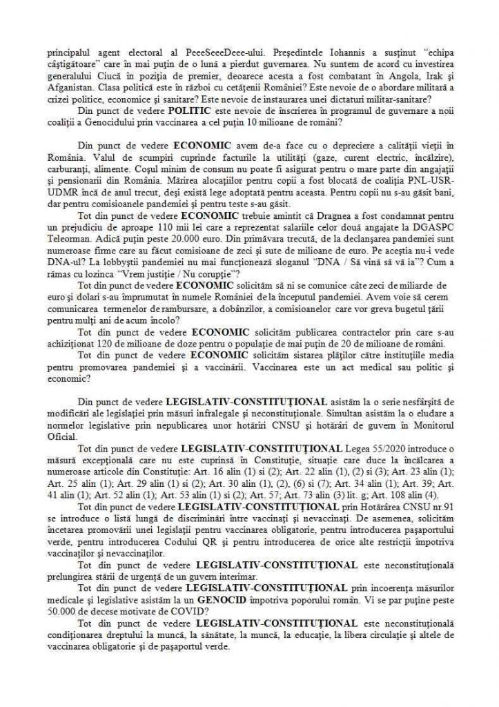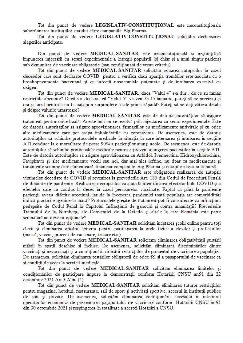 Manifestanții vor cere, printre altele, încetarea școlii online pentri toți elevii, eliminarea obligativității purtării măștii de protecție, a limitelor și condiționărilor de participare impuse la demonstrații, a tuturor restricțiilor pentru magazine, hoteluri, săli de sport, precum și eliminarea certificatului verde.
