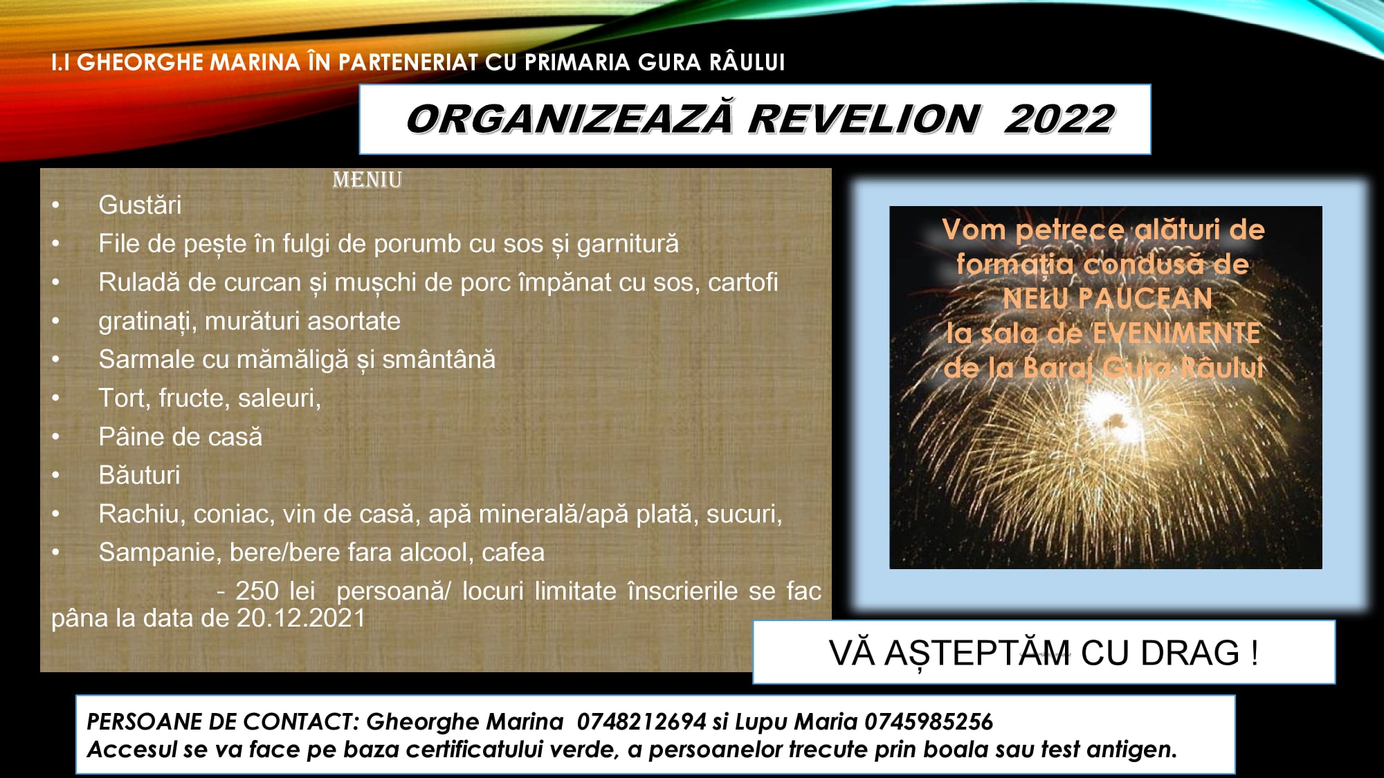 Atmosfera va fi întreținută de formația condusă de Nelu Păucean, iar costul participării este 250 lei/ persoană. Locurile sunt limitate, sala putând găzdui până la 50% din capacitatea maximă, conform normelor în vigoare. Înscrieri și rezervări se pot face până în 20 decembrie, la numerele de telefon 0748.212.694 – Marina Gheorghe sau 0745.985.256 – Maria Lupu.