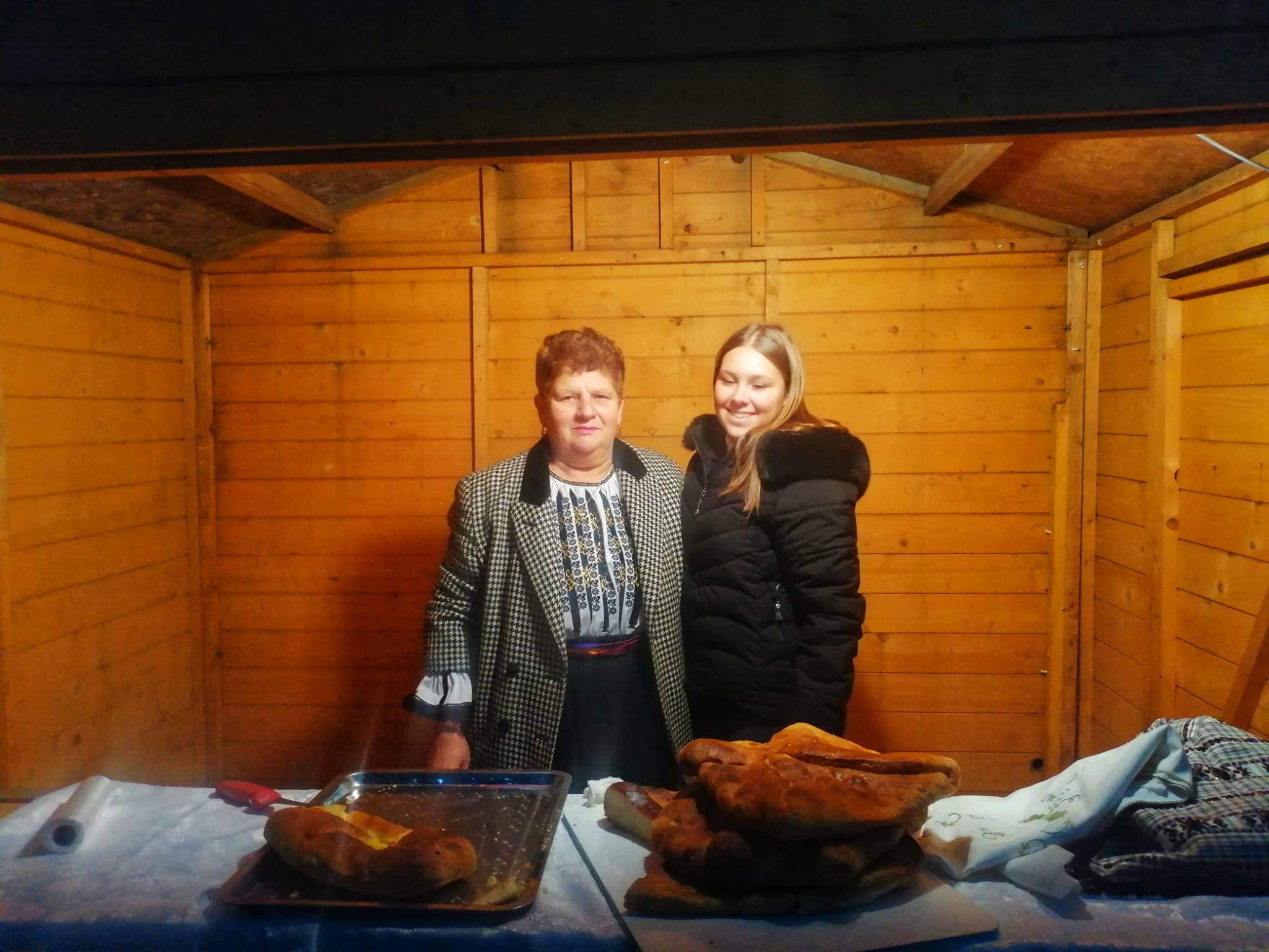 Renumita plăcintă de Tălmăcel a fost adusă la Târg de Larisa Neagoe și bunica ei, Elena Dancu. „Plăcinta de Tălmăcel, cu brânză și cartofi pe vatră, este un brand al localității noastre. Are un gust tradițional, iar rețeta este din moși-strămoși. Noi spunem că e rețeta satului”, a spus Larisa Neagoe. Tânăra a venit la Târgul de Crăciun de la Tălmaciu alături de bunica sa. Elena Dancu vinde plăcintele de Tălmăcel îmbrăcată în costum popular. “Așa se face! Îmbraci costumul când le vinzi! Uneori, și când le fac pun costumul pe mine. Eu am 66 de ani și întotdeauna port costumul popular cu mare drag. Când m-am căsătorit, tot în costum popular am fost!”, a spus doamna Elena.