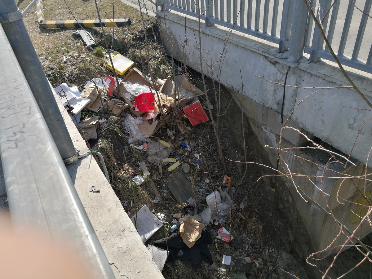 Pe marginea drumului și sub podul care asigură accesul către centrul comercial se pot vedea o mulțime de gunoaie aruncate de indivizi certați cu normele de conviețuire civilizată.