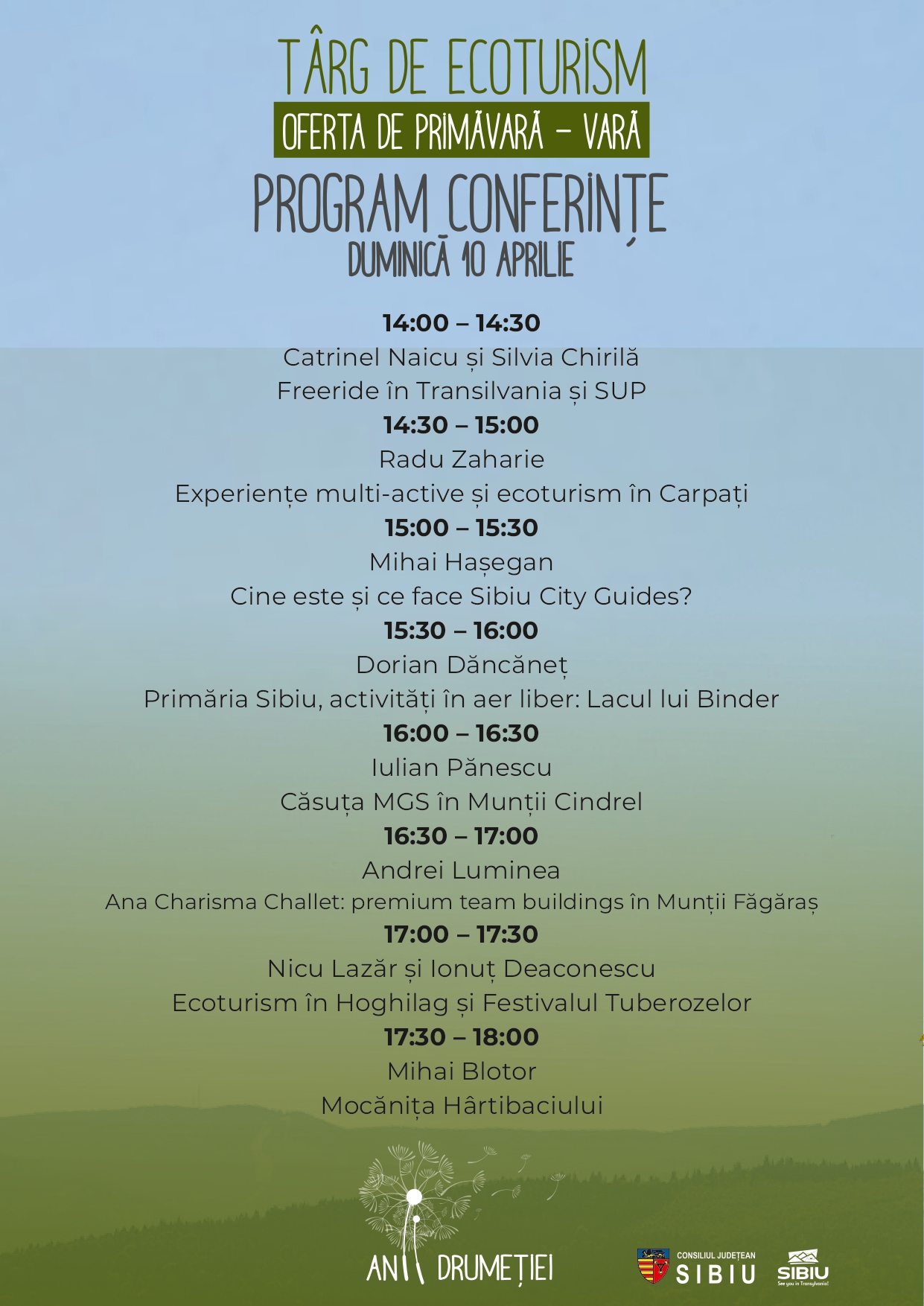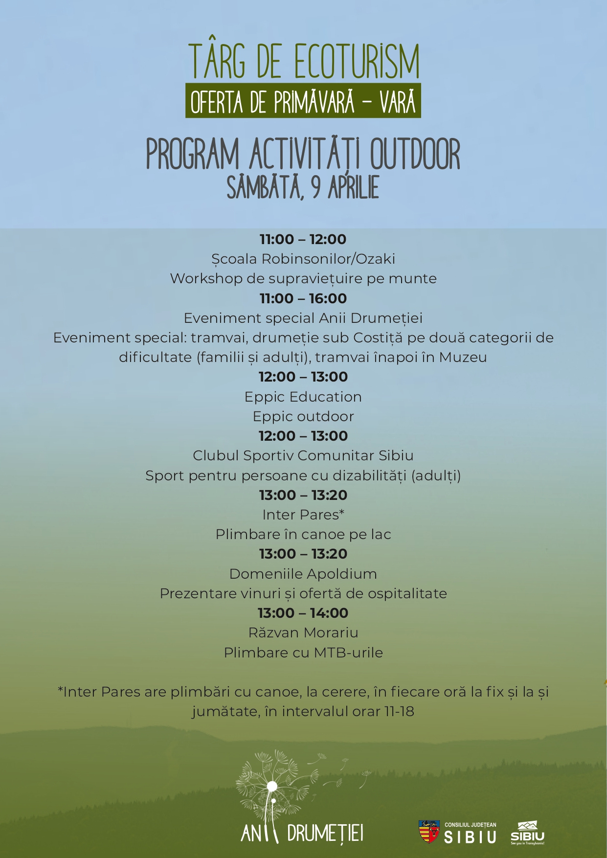 „Prin intermediul noii ediții, organizatorii doresc să sublinieze faptul că mișcarea în aer liber este accesibilă tuturor persoanelor, fără bariere. Împreună cu Clubul Sportiv Comunitar Sibiu, sâmbătă de la orele 12, va avea loc o sesiune de sport dedicată adulților cu dizabilități (motorii, deficiențe de auz / văz, mentale ș.a.), compusă din: exerciții de gimnastică, jocuri și, acolo unde este posibil, o alergare scurtă prin Muzeul ASTRA (chiar și în scaun cu rotile). O componentă importantă a târgului este reprezentată de sesiunea de conferințe, în cadrul căreia specialiștii din domeniu vor dezbate teme de actualitate în ceea ce privește tendințele ecoturismului și vor prezenta exemple de bune practici”, au mai spus organizatorii.