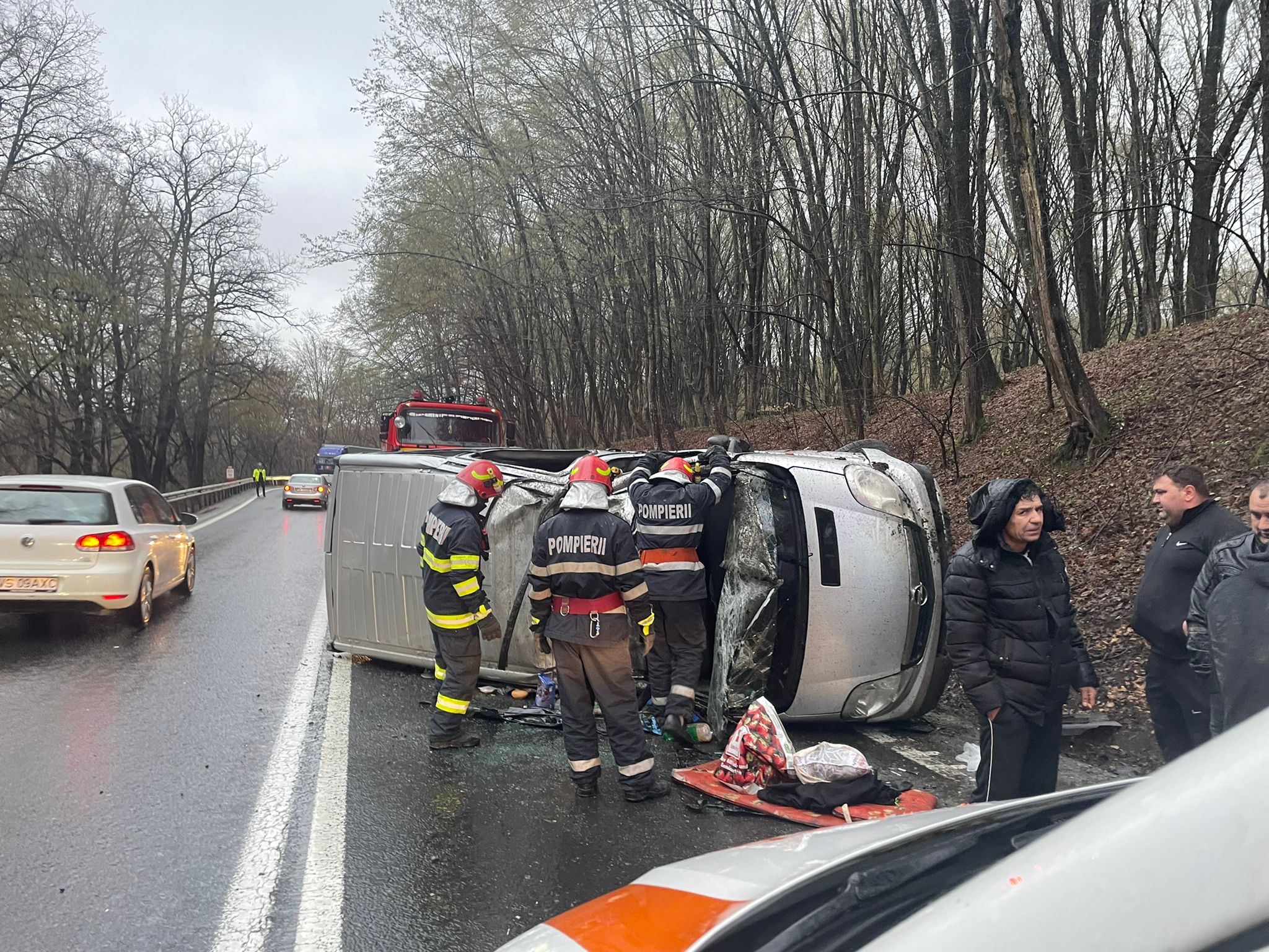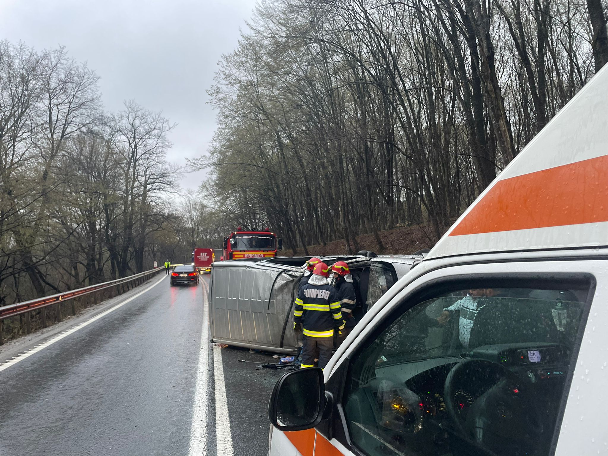 Din primele cercetări efectuate, a rezultat că șoferul unui microbuz destinat transportului de persoane, condus pe DN 1, direcția Sibiu – Brașov, la km. 292+500m, ar fi pierdut controlul direcției de deplasare, răsturnându-se pe carosabil, pe sensul opus de mers.