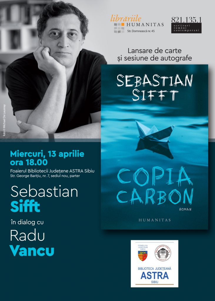 Biblioteca Județeană ASTRA Sibiu va găzdui lansarea cărții „Copia Carbon”, al doilea roman al autorului Sebastian Sifft. Evenimentul este organizat miercuri, 13 aprilie, de la ora 18, în foaierul Corpului B al Bibliotecii ATRA, de către Editura Humanitas și Librăria Humanitas „Constantin Noica” Sibiu. Cu acest prilej, invitat în dialog cu autorul va fi Radu Vancu, poet, prozator și universitar sibian.
