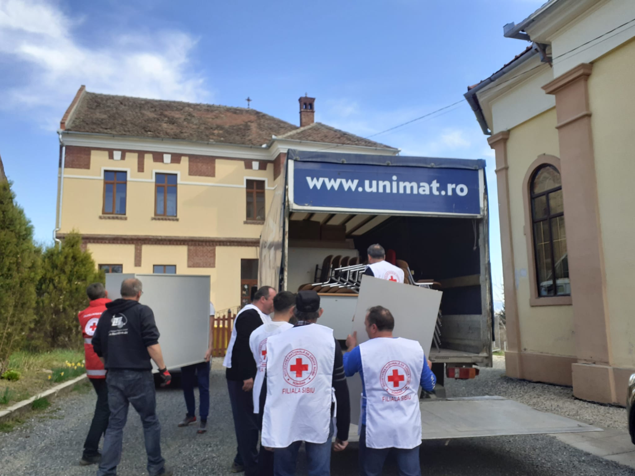 Crucea Roșie Sibiu derulează o amplă campanie umanitară în Gușterița, unde a distribuit peste zece tone de articole de îmbrăcămite, încălțăminte, jucării, sucuri dar și mobilier pentru Șura Culturală.