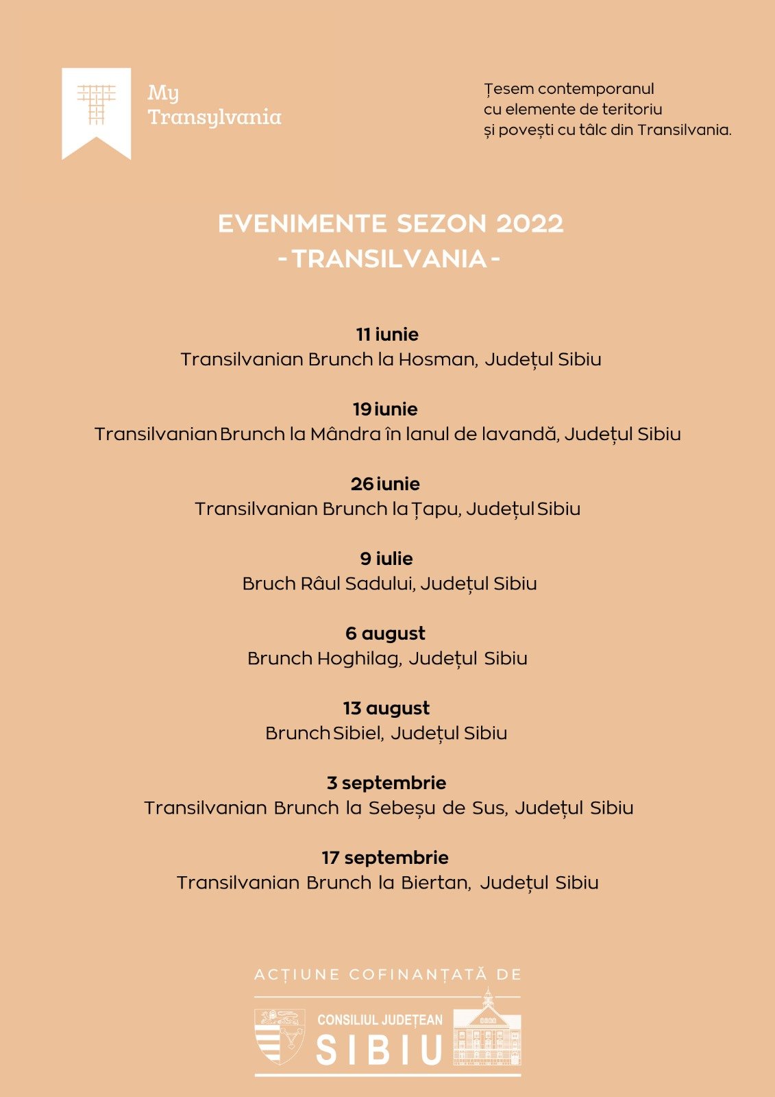 Ne așteaptă o vară cu gusturi de neuitat, pentru că pe tot parcursul sezonului estival cei ce doresc să descopere atât locurile fermecătoare din județul Sibiu, cât și bucatele specifice locului, au destule prilejuri pentru a face asta. Astfel, conform CJ Sibiu, în 11 iunie, se va organiza un brunch la Hosman, în 19 iunie la Mândra, în 26 iunie în localitatea Țapu, în 9 iulie la Râu Sadului, în 6 august la Hoghilag, în 13 august la Sibiel, în 3 septembrie în Sebeșu de Sus și în 17 septembrie la Biertan.