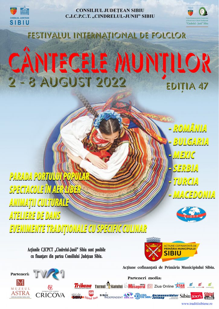 „Cântecele Munților”, cel mai așteptat eveniment folcloric al verii, începe mâine! Evenimentul, aflat la cea de-a 47-a ediție, se desfășoară în perioada 2-8 august, în diferite spații din municipiul Sibiu și aduce cântece și jocuri populare din Europa, Asia și America.Evenimentul este organizat de Consiliul Județean Sibiu și Centrul Județean pentru Conservarea și Promovarea Culturii Tradiționale „Cindrelul – Junii” Sibiu. Acțiunea este cofinanțată de Primăria Municipiului Sibiu.